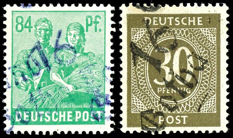 10 pfennigs grey and 30 pfennigs bright brown yellow imperforated on money order ZITTAU 22.12.45 to Suelzhayn, with all note, arrival 7.1.46, photo expertize STROEH BPP". are among the SBZ-rarities, . perfect" (52,55) (page)