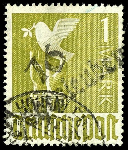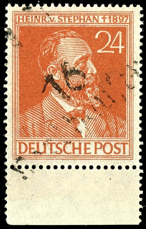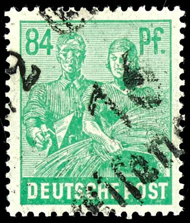 10 pfennigs dark yellow green in the plate printing from upper margin (perforations going through margins) in mixed franking with 6 pfennigs worker with district handstamp imprints "Berlin 54" and 20 pfennigs numeral, 1 Mark and 5 Mark dove Control Council, all from upper margin on about 2 pfennigs