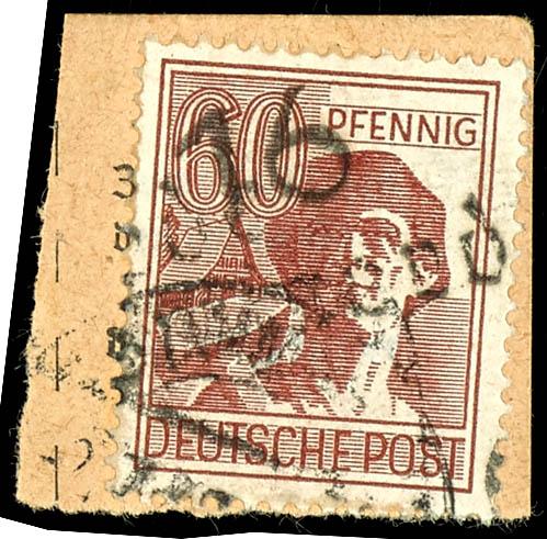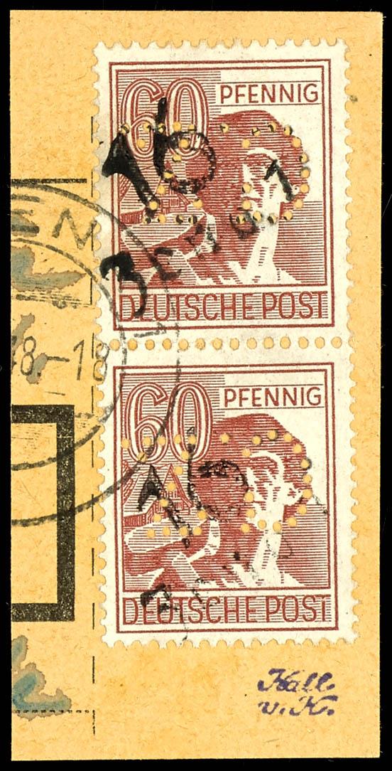 60 pfennigs in the pair with overprint 16 Jena 1 and punching CZ (Carl Zeiss), parcel card section, perfect, study group group 8, expertized from Heintze BPP, Michel / study group 180.- (A179III) 60 Pfennig im Paar mit Aufdruck 16 Jena 1 und Lochung CZ (Carl Zeiss), Paketkartenabschnitt, einwandf
