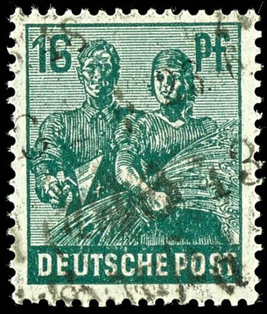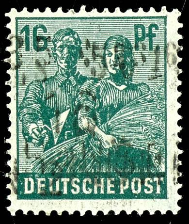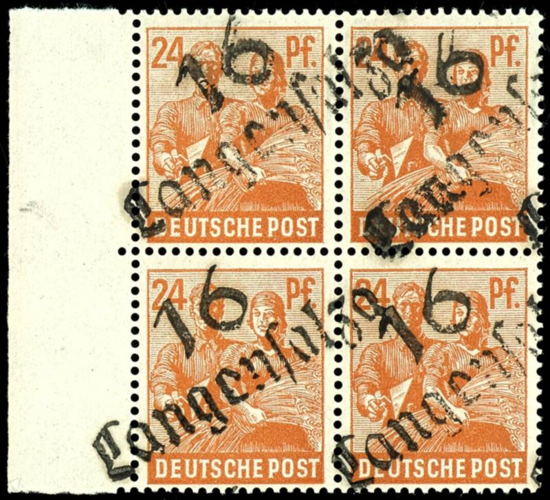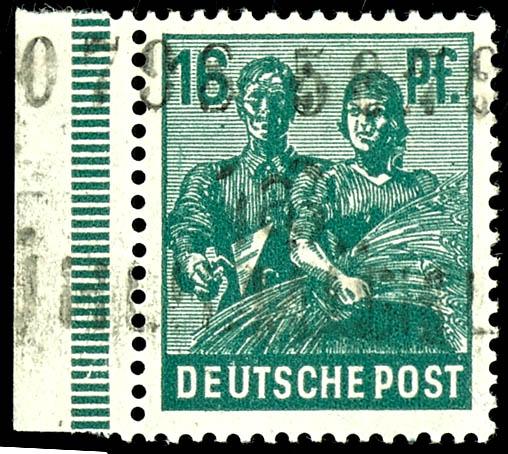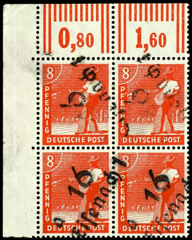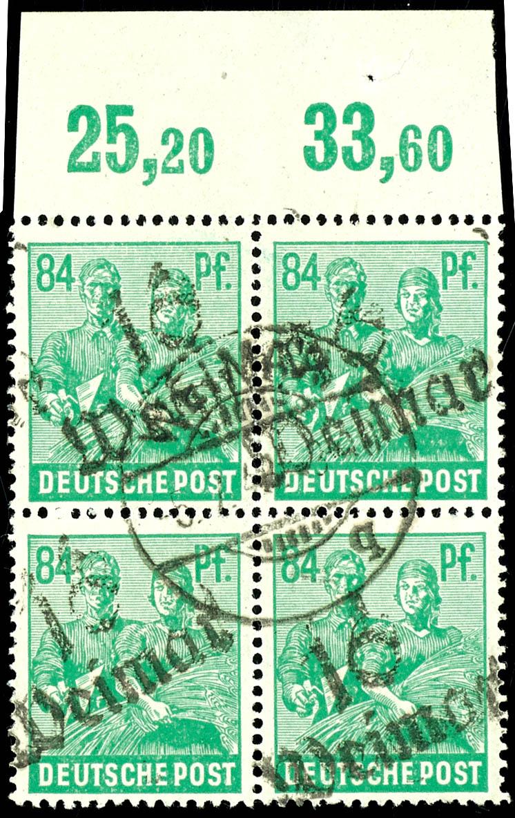 16 pfennigs worker series with machines overprint "Soviet occupying zone", blackish opal green, block of four from the lower margin (little in the sheet four perforation separated), mint never hinged, very fine, unsigned, photo expertize Dr. Karsten Ruscher BPP "the quality of the stamps is perfect.