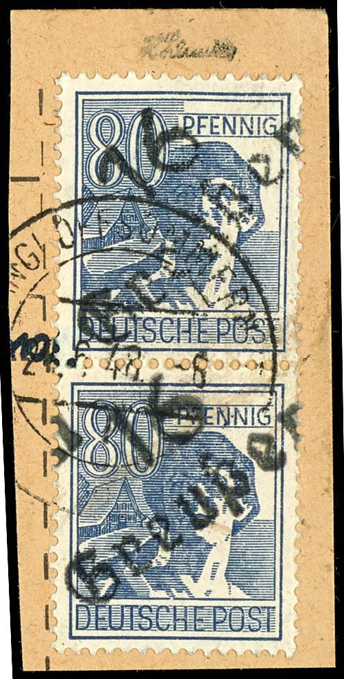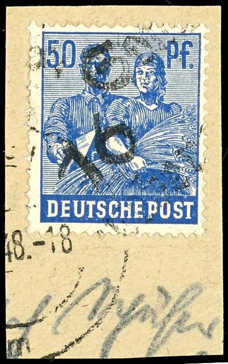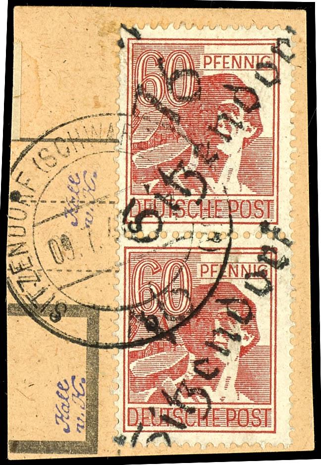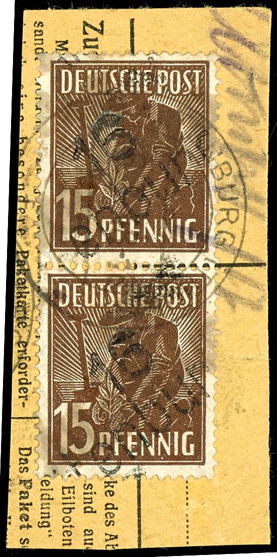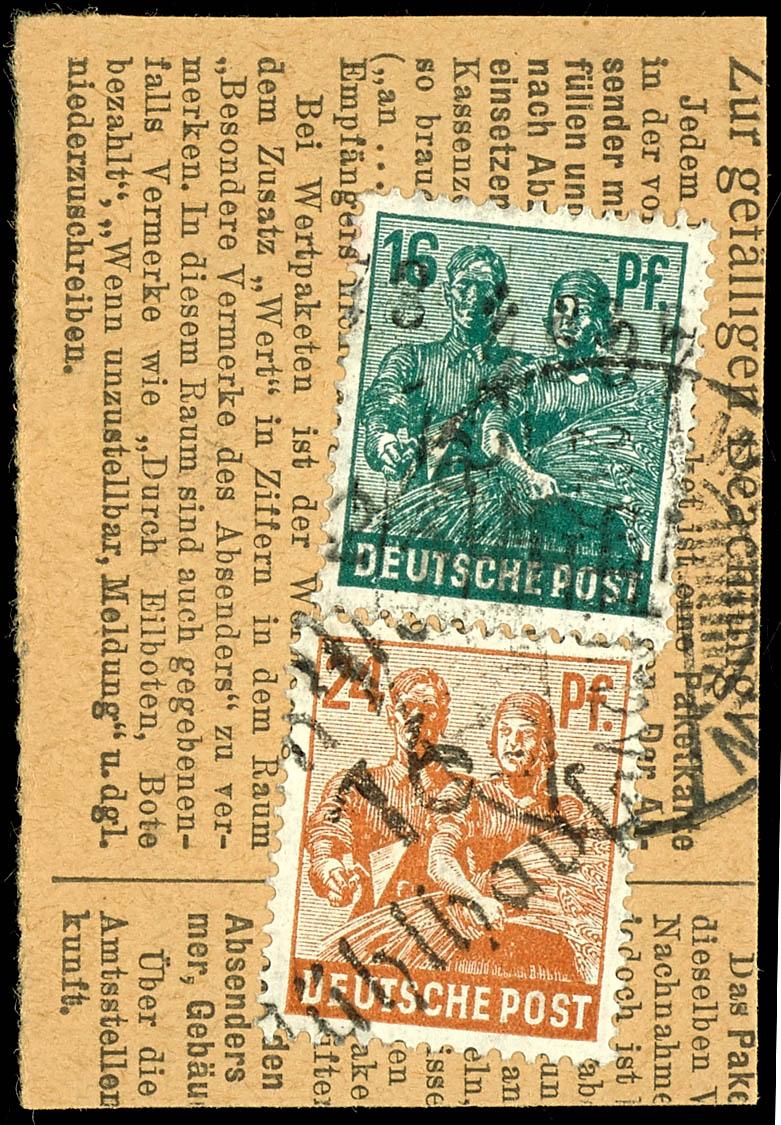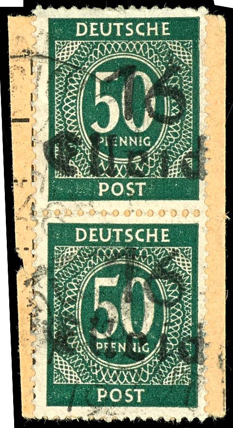 50 pfennigs, vertical pair with overprint 16 Gispersleben, parcel card section, perfect, study group group 14, very rare, Michel / study group 2.025.- (178III) 50 Pfennig, senkrechtes Paar mit Aufdruck 16 Gispersleben, Paketkartenabschnitt, einwandfrei, Arge Gruppe 14, sehr selten, Mi./Arge 2.025