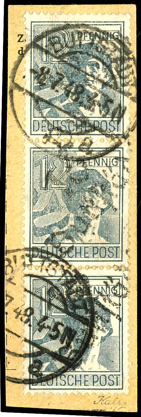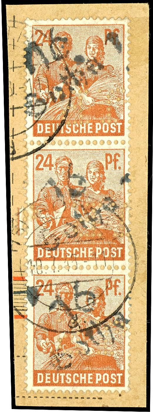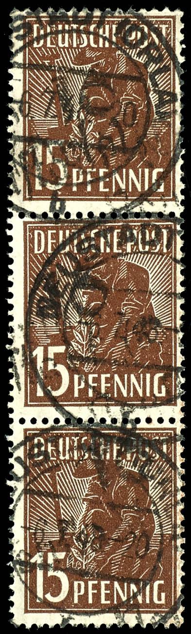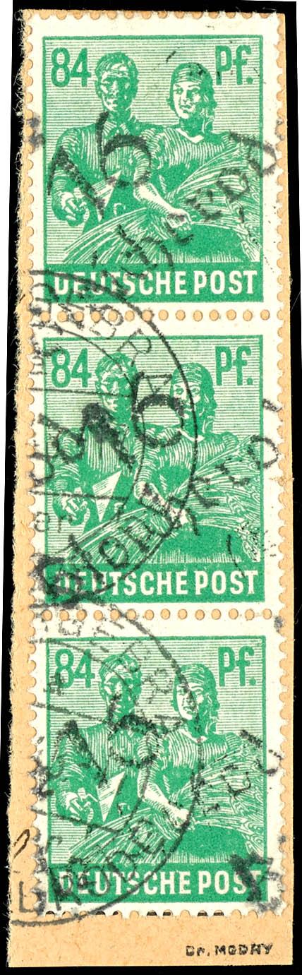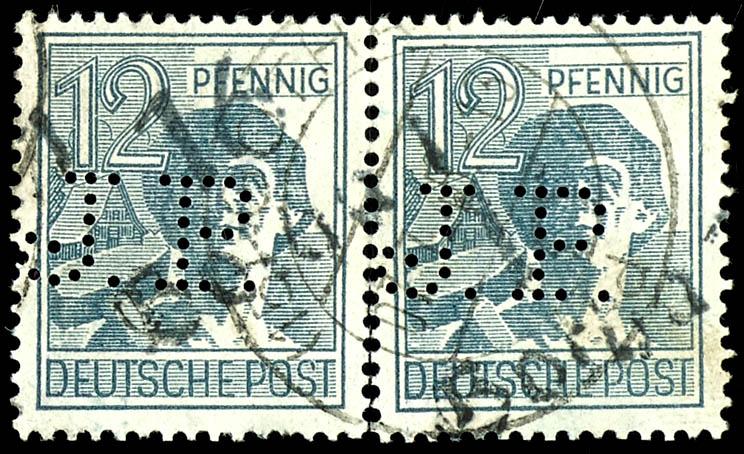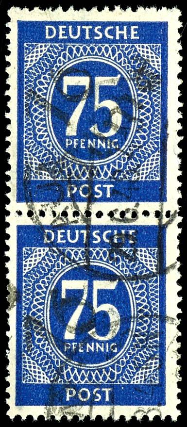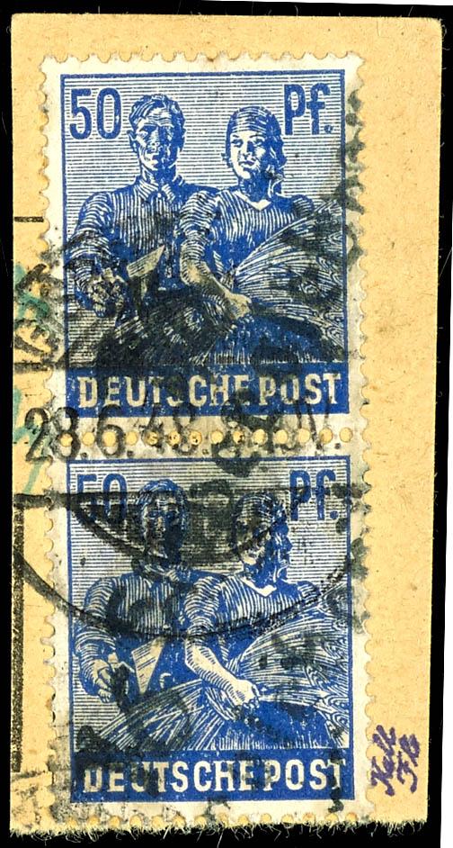 6 Pf. land reform in the vertical pair with postmaster roulette from Goerzke, clear and with well-centered cancellation "GOERZKE (BZ MAGDEBURG) 5.2.46, lower stamp 1 perf small mould stain, Michel 500.- (85waD) 6 Pf. Bodenreform im senkrechtem Paar mit Postmeisterdurchstich von Görzke, klar und z