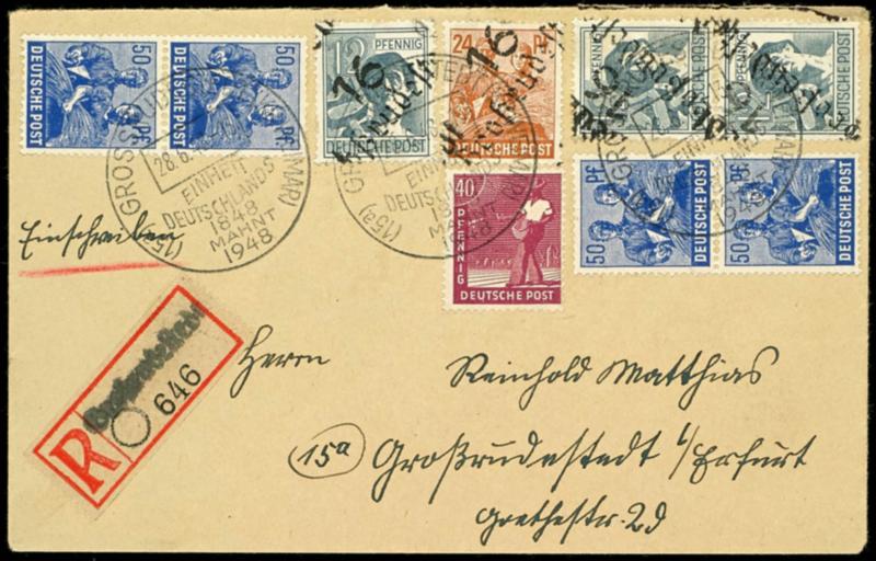 10 pfennigs numerals grey, four piece with 2 x 3 pfennigs and 8 pfennigs as well Thuringia 6 pfennigs on complete address label for a registered sample from SCHMOELLN 27.2.46 to Nuremberg, properly franked with in total 60 Pfg franked, exceptional scarce postage rate, photo expertize Bodo STROEH BPP