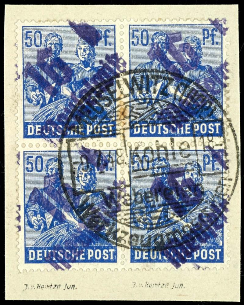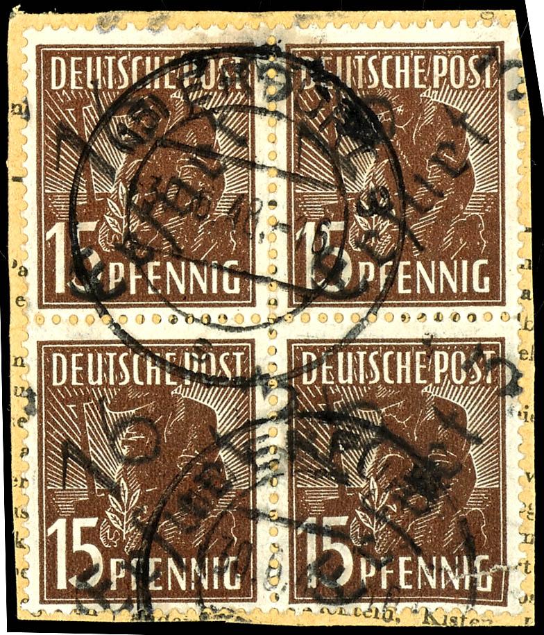 10 pfennigs postal stamp, dark gray, uy-paper, cancelled block of four with centered cancellation "Stollberg e 26.11.45", apart from a not soluble rest of hinge at of the lower left stamp in perfect condition, photo expertize Jens Kunz BPP, Michel 320.- plus (52auy(4)) (page)
