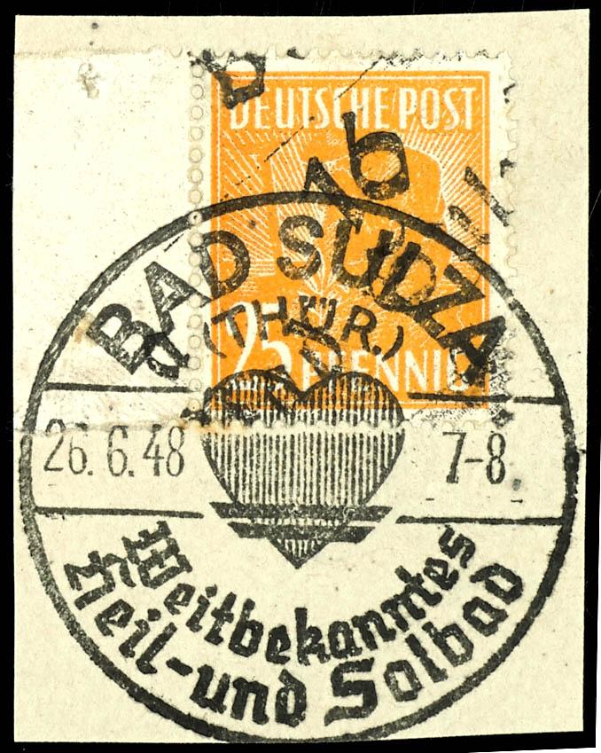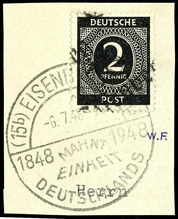 2 pfennigs numeral with overprint 16 Eisenberg, letter piece with special cancel "unit Germany's", perfect, expertized from Heintze BPP, Michel 600.- (IaIII) 2 Pfennig Ziffer mit Aufdruck 16 Eisenberg, Briefstück mit Sonderstempel "Einheit Deutschlands", einwandfrei, geprüft v. Heintze BPP, Mi. 6