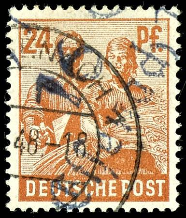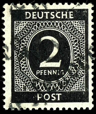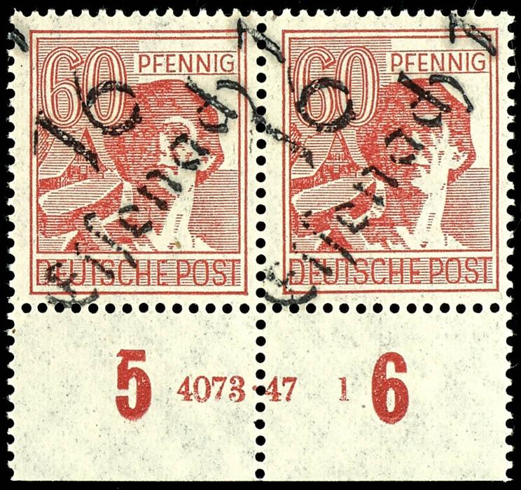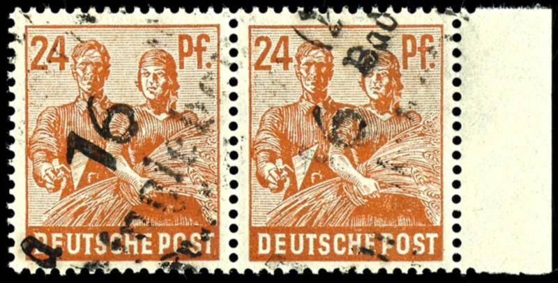 10 pfennigs numerals, dark reddish brown in a horizontal pair from right margin, used "Magdeburg 12.2.46", very fine, expertized STROEH BPP, Michel 500.- (72) 10 Pfennig Ziffern, dunkelrötlichbraun im waagerechten Paar vom rechten Rand, gestempelt "Magdeburg 12.2.46", tadellose Erhaltung, geprüft