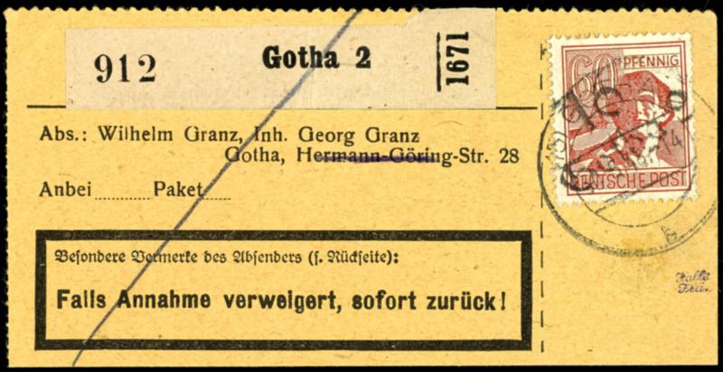 60 pfennigs with overprint 38 Demmin on Need package card (money order form) from Jarmen, notation "delivery refused", attest Fullgraf BPP, study group valuation for single franking 600.- (A179IX) Certifi