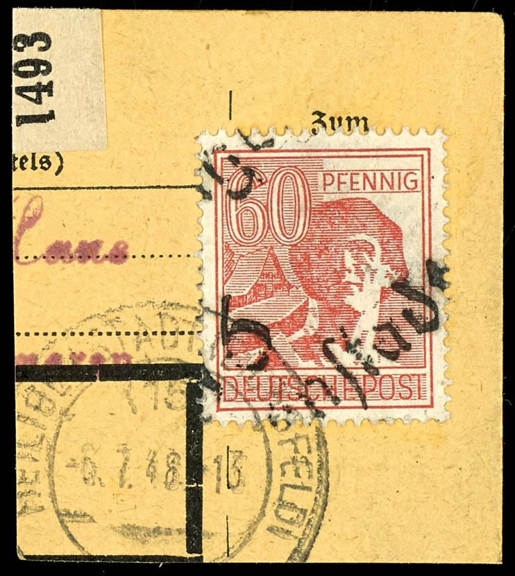 lightly 60 with black overprint 16 Heiligenstadt, parcel card section, perfect, study group group 7, expertized from Heintze BPP, Michel / study group 910.- (179III) Helle 60 mit schwarzem Aufdruck 16 Heiligenstadt, Paketkartenabschnitt, einwandfrei, Arge Gruppe 7, geprüft v. Heintze BPP, Mi./Arg