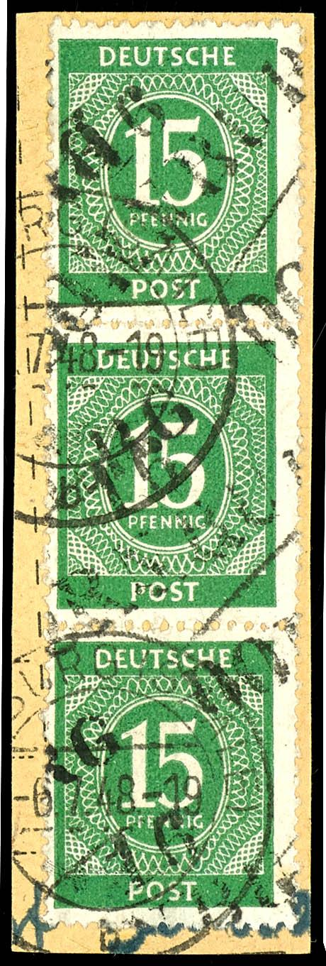 numeral 15 with overprint 16 Dornburg, vertical strip of three on parcel card section, perfect, expertized from Heintze BPP, Michel / study group 140.- (IiIII) Ziffer 15 mit Aufdruck 16 Dornburg, senkrechter Dreierstreifen auf Paketkartenabschnitt, einwandfrei, geprüft v. Heintze BPP, Mi./Arge 14