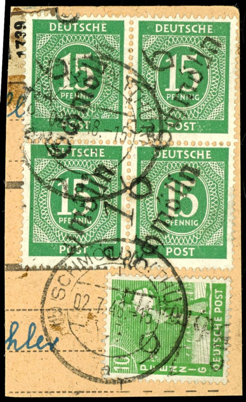 numeral 15 (4) and 10 pfennigs with overprint 16 Schmoelln e, parcel card section, perfect, expertized Ballschmidt BPP, Michel 167.- (Ii,169III) Ziffer 15 (4) und 10 Pfennig mit Aufdruck 16 Schmölln e, Paketkartenabschnitt, einwandfrei, geprüft Ballschmidt BPP, Mi. 167.-