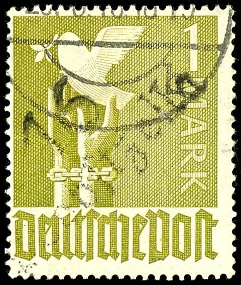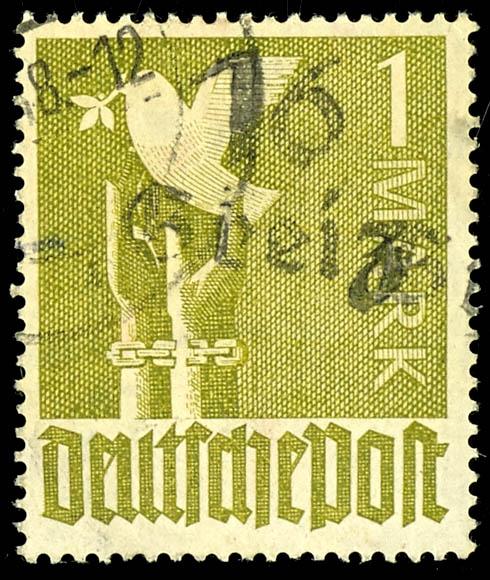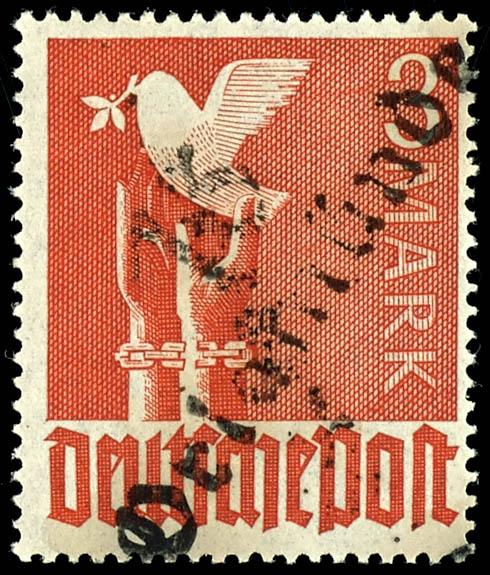 6 pfennigs "Victim of the fascism", blackish yellow emerald-green, upper margin copy, plate flaw VII, centric cancellation "Schwerin (Meckl) 1 o 21.10.45", very fine, expertized Kramp BPP, photo expertize Hans Ludwig Kramp BPP "in perfect condition. ", Michel 500.- (without valuation of the plate fl