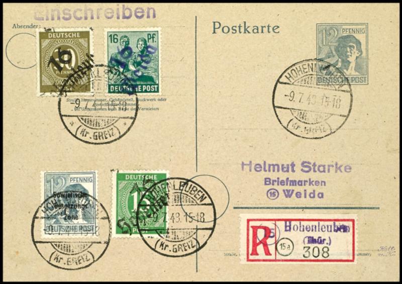 numeral 15 and 30 as well 16 pfennigs with overprint 16 Weida and 12 pfennigs with Soviet Zone overprint on postal stationery 12 pfennigs without overprint, slightly overfranked, perfect, expertized Dr. Boeheim BPP, Michel of the stamps 170.- (Ii,It,176III) Ziffer 15 und 30 sowie 16 Pfennig mit A