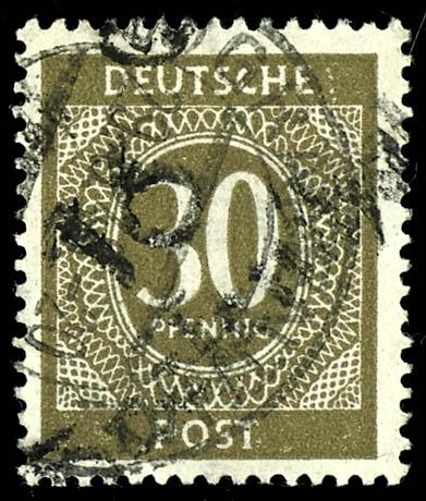 30 pfennigs black olive, white gray paper with steeply rising striping, perforated L11, cancelled by not indefinable part of a cancellation - possibly a block of four cancellations, these type is hardly ever offered, photo expertize Erich Herpichboehm BPP "in perfect condition. ", Michel for ** 6.50