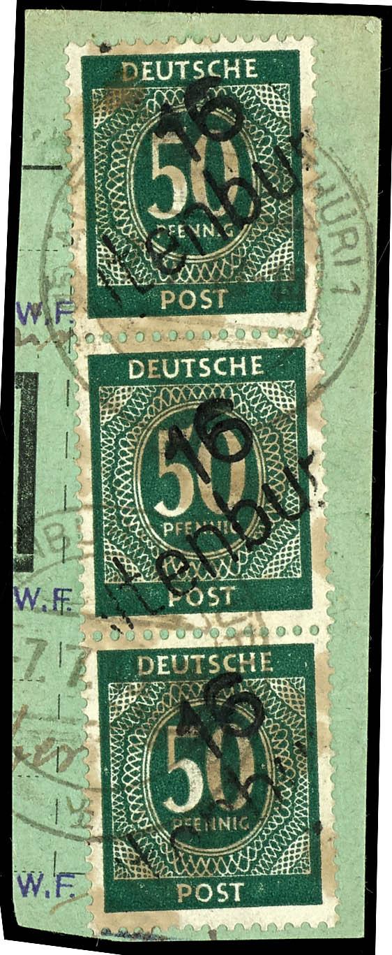 numeral 50 in the vertical strip of three on parcel card section, corrective imprint with double overprint in biscuit and black 16 Altenburg, type e, perfect, very rare, expertized Wagner BPP, Michel / study group 800.- (ItIII) Ziffer 50 im senkrechten Dreierstreifen auf Paketkartenabschnitt, Kor