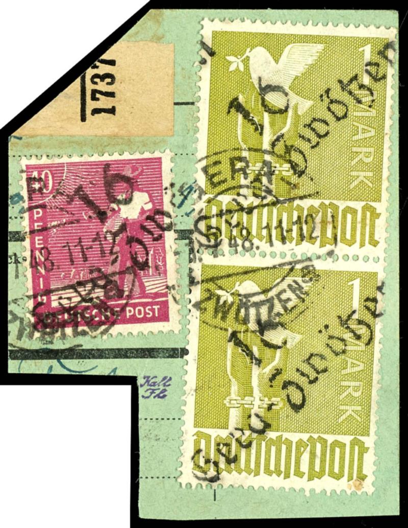 1 Mark in the pair along with 40 pfennigs on parcel card section with overprint 16 Gera Zwoetzen, perfect, expertized Petzold BPP, Michel 90.- (IIaIII) 1 Mark im Paar zusammen mit 40 Pfennig auf Paketkartenabschnitt mit Aufdruck 16 Gera-Zwötzen, einwandfrei, geprüft Petzold BPP, Mi. 90.-