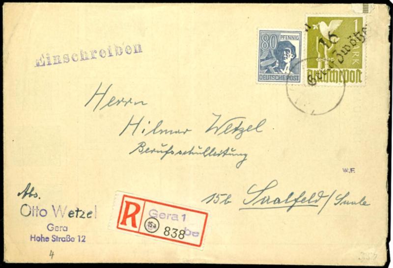 1 Mark with overprint 16 Gera Zwoetzen, along with 80 pfennigs Control Council on properly franked registered cover, perfect, expertized Dr. calf PBB, Michel 250.- (IIaIII) 1 Mark mit Aufdruck 16 Gera-Zwötzen, zusammen mit 80 Pfennig Kontrollrat auf portorichtigem Einschreibebrief, einwandfrei, g