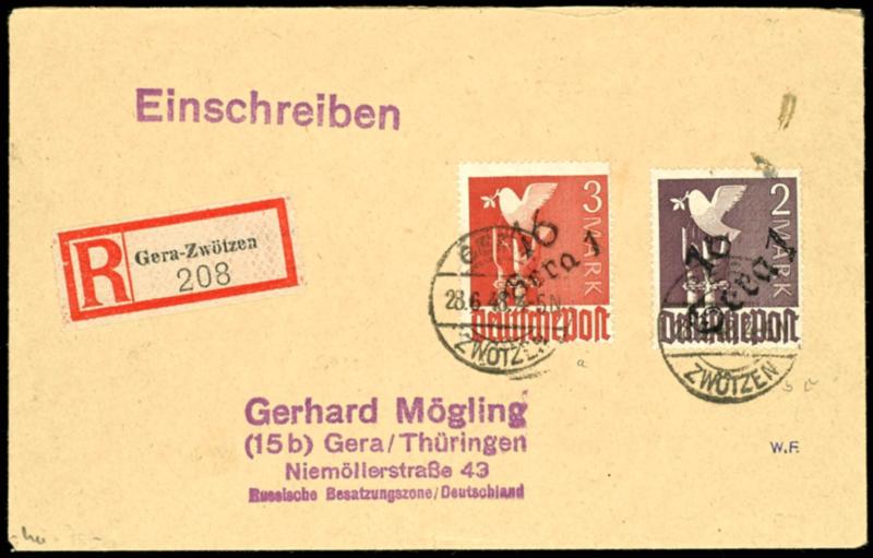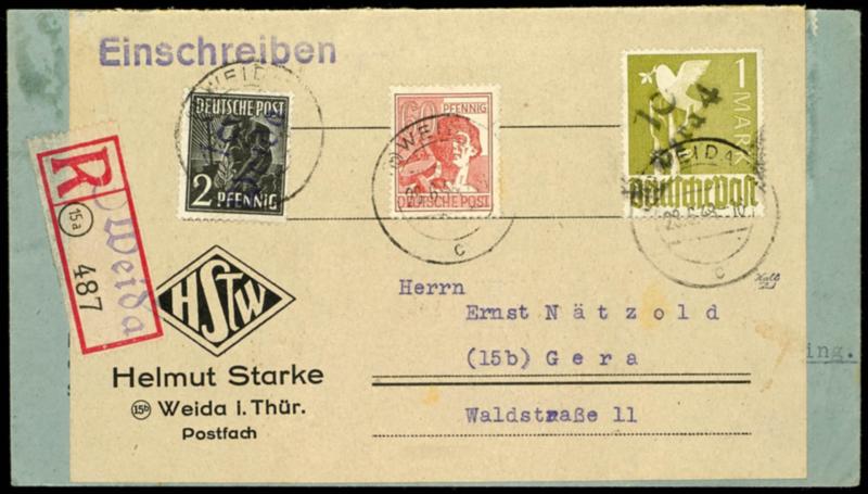 1 Mark with overprint 16 Gera 4 and 2 pfennigs with overprint Weida, as well 60 pfennigs Control Council on properly franked registered cover, perfect, expertized from Heintze BPP, Michel 256.- (IIa,166III) 1 Mark mit Aufdruck 16 Gera 4 und 2 Pfennig mit Aufdruck Weida, sowie 60 Pfennig Kontroll