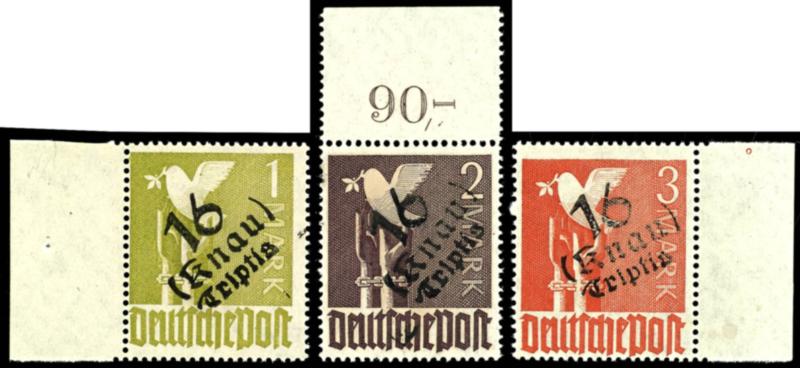 1, 2, 3 Mark with overprint 16 (Knau) Triptis, mint never hinged, perfect, all values BPP expertized, Michel 120.- (IIa-cIII) 1, 2, 3 Mark mit Aufdruck 16 (Knau) Triptis, postfrisch, einwandfrei, alle Werte BPP- geprüft, Mi. 120.-