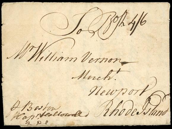 TRANS-ATLANTIC LETTER ENGLAND TO RHODE ISLAND 1752 - Stampless folded letter datelined April 10, 1752 from London to Newport, manuscript ship-letter postmark, endorsed 'via Boston', via the ship Knowles, rated 2p ship letter fee and 4p inland postage, converted to 4/6 Old Tenor currency (which h