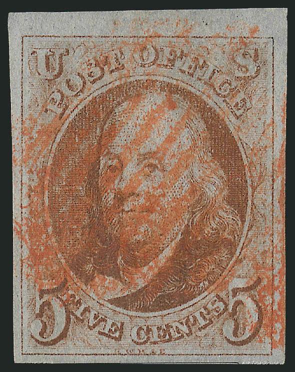 5c Orange Brown (1b). Large margins all around, lovely color complemented by red grid cancel<