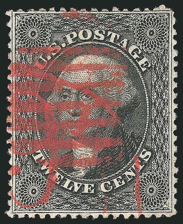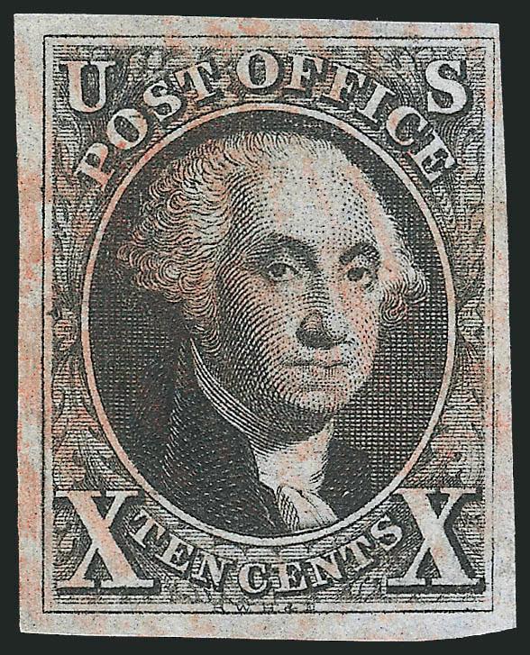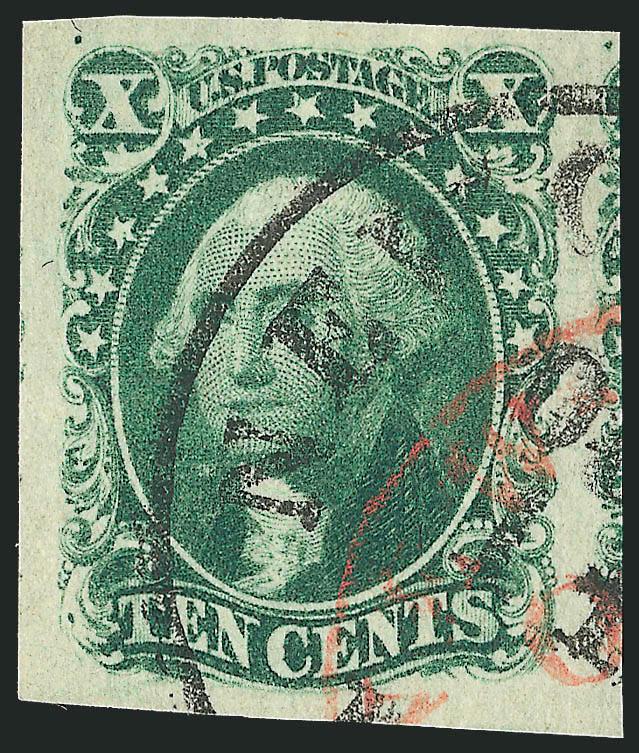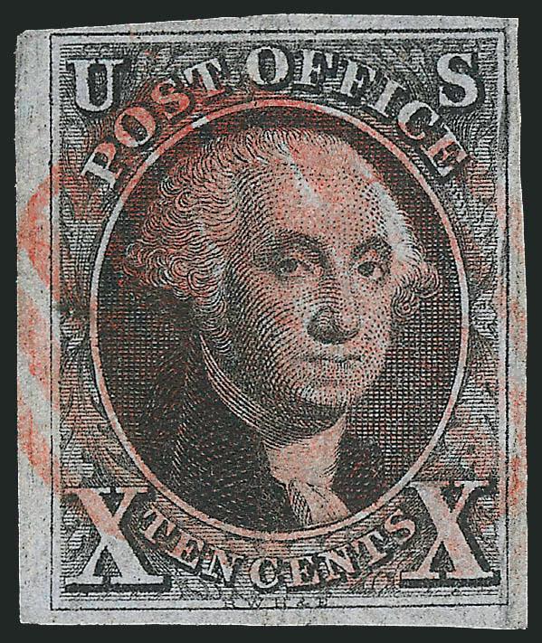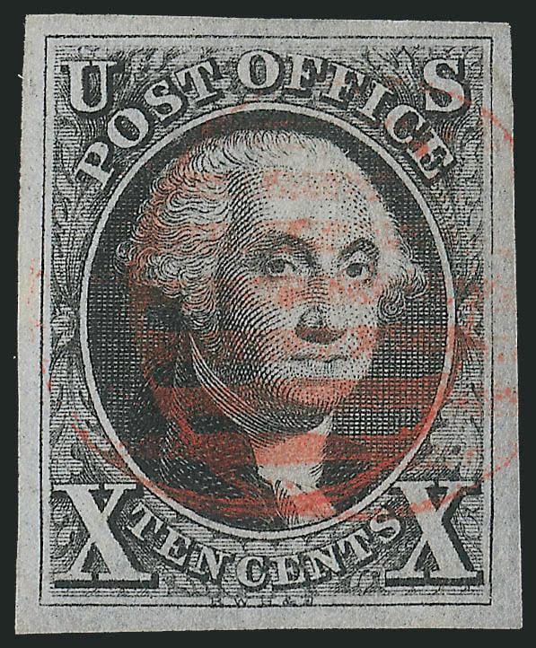 10c Black (2). Ample to huge margins, bright red grid cancel, intense shade, Very Fine