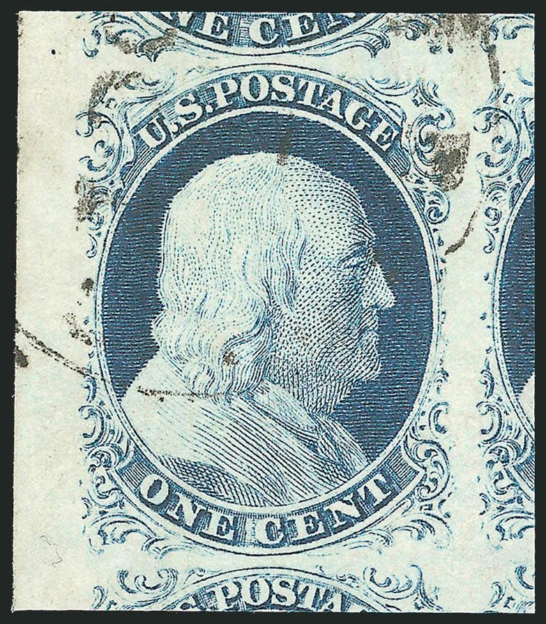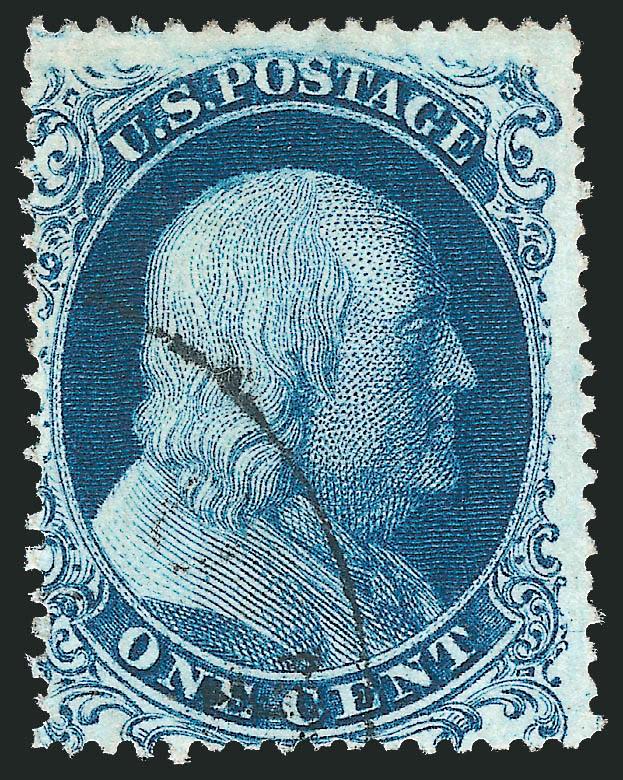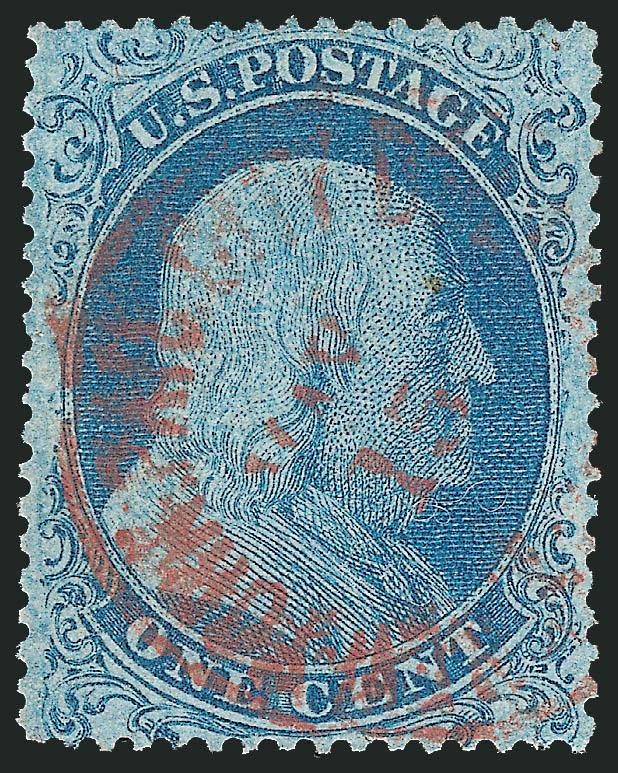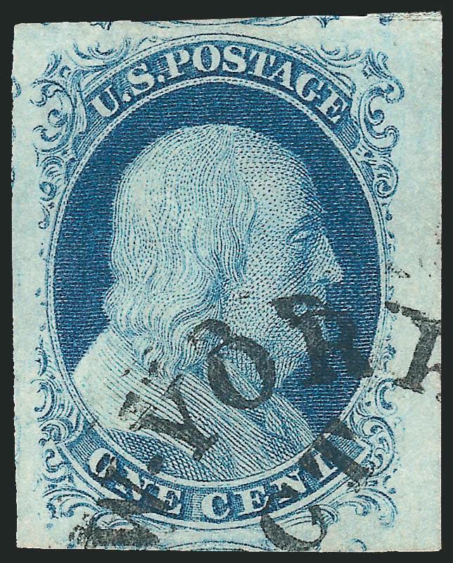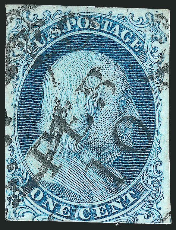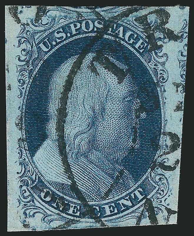 1c Blue, Ty. Ia (6). Position 92L4, large margins all around, rich color, 1857 circular dates