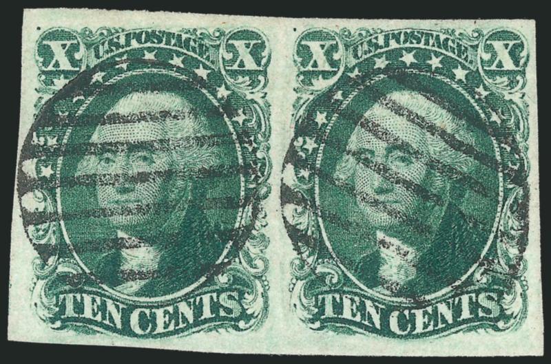 10c Black (2). Horizontal pair, ample to large margins, crisp impression, neat strikes of red