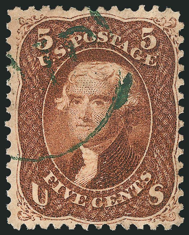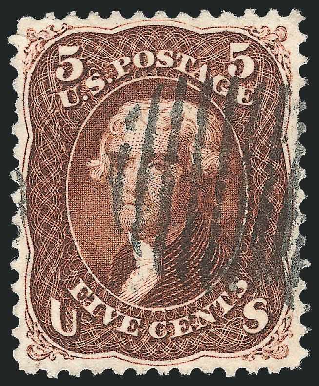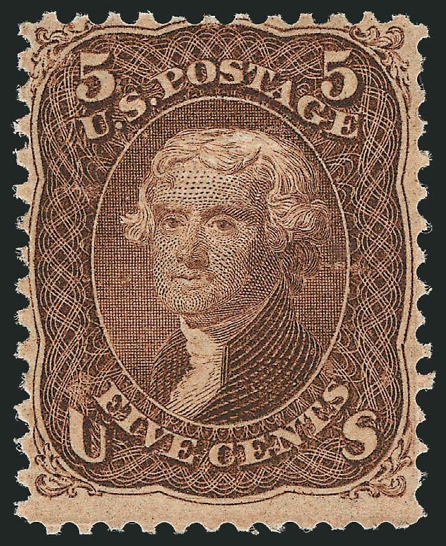 5c Brown (76). Perfectly centered with unusually wide margins, brilliant color and sharp proo