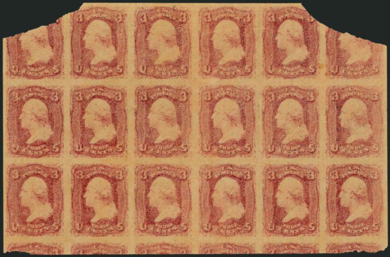 3c Rose, Decalcomania Essay (79-E). Block of 18, mostly huge margins incl. part of adjoining