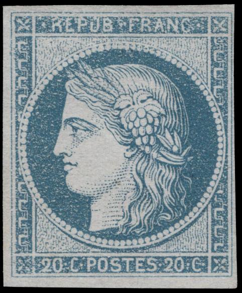 FRANCE, 1849, 40c BLUE (UNISSUED) UNUSED, #7 var., full margins, without gum as issued, very fine, rare, with 2022 Pascal Scheller cert., listed in footnote in Scott at $28,000.00, Yvert #5B @ €16,000.00. both values for no gum