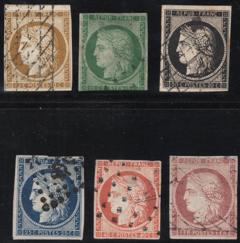 FRANCE FIRST ISSUE USED GROUP, #1-3, 6-7, 9, margins to in, small flaws, cat. $2,085.00