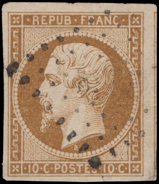 FRANCE, 1852, 10c BISTER "REPUB FRANCE" USED, #10, full margins, very fine, signed by Pascal Scheller, cat. $450.00, Yvert #9 @ €850.00