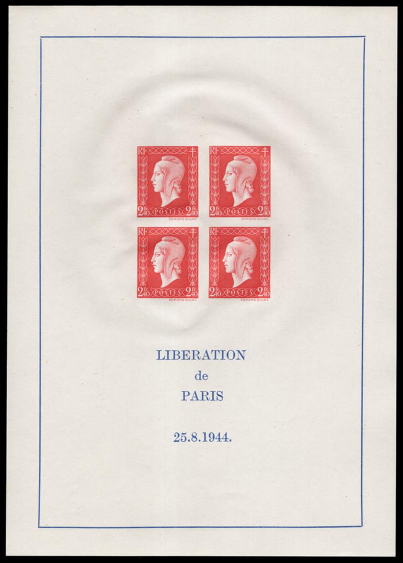 FRANCE, 1944, THE MARIANNE SPECIAL ISSUE SOUVENIR SHEET WITH 4 x 2.40fr IMPERFORATE STAMPS, #515 var., mentioned in footnote under the set, "bubbly" area around stamp images as all authentic sheets show, never hinged, however a couple spots in the gum area, very fine, rarely offered, with 20