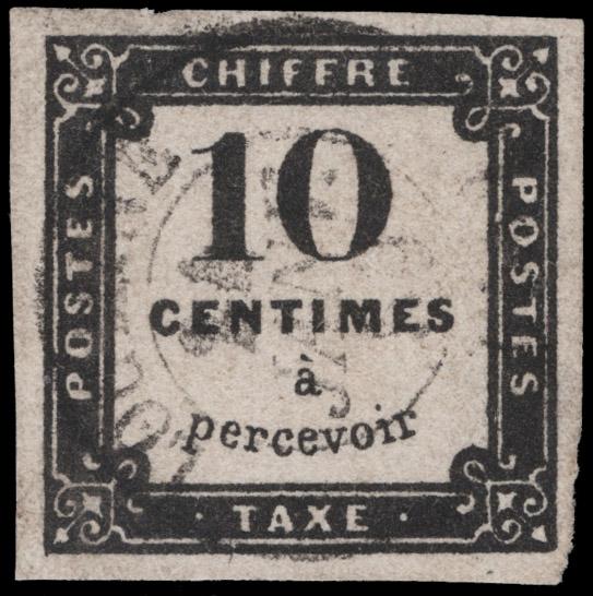 FRANCE, 1859, 10c BLACK (LITHO) POSTAGE DUE USED, #J1, full margins, very fine, signed by Pascal Scheller, cat. $240.00, Yvert TT #1 @ €350.00