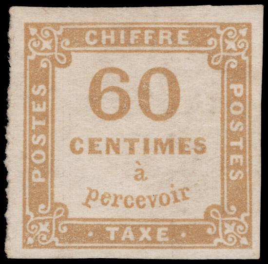 FRANCE, 1871, 60c BISTER POSTAGE DUE UNUSED, #J9, full margins, no gum, very fine, signed by Pascal Scheller, cat. $225.00, Yvert TT #8 @ €800.00