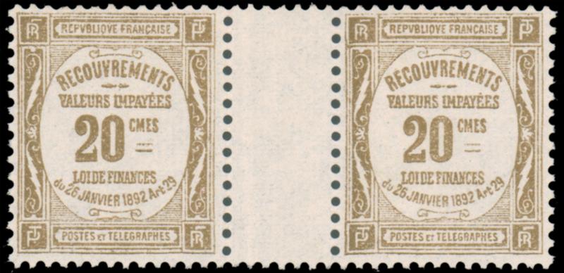 FRANCE, 1919, 20c BISTER POSTAGE DUE GUTTER PAIR NH, #J48, well-centered and fresh, fold in gutter, stamps perfect and very fine, cat. $150.00, Maury TT #45 @ €210.00, both values for single stamps