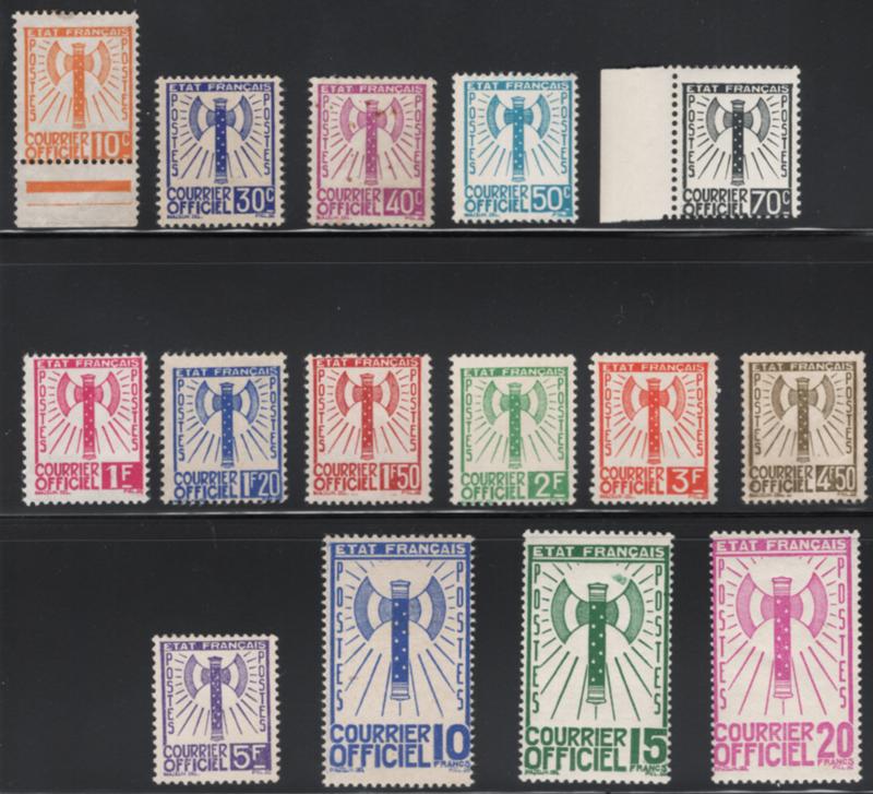 FRANCE, 1943 OFFICIAL ISSUES COMPLETE SET, Yvert #1-15, 70c (key value), 15fr and 20fr mint never hinged, other values without gum, fine-very fine overall, 70c signed by Pascal Scheller, cat. Yvert £3,750.00