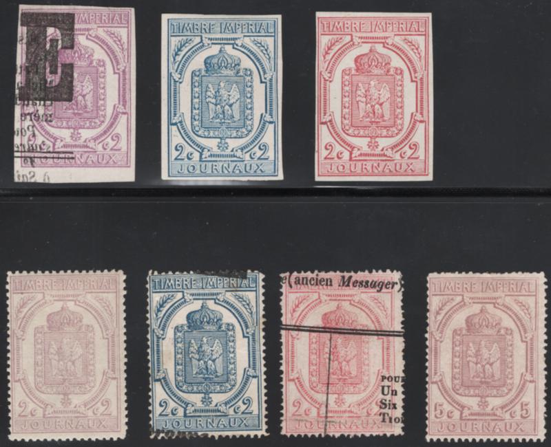 FRANCE, 1869-69, NEWSPAPER STAMP GROUP, incl. 2-cent imperfs lilac used, blue (signed Calves & Miro) and rose carmine (signed J F Brun) unused, 2-cent perfed lilac mint, blue and rose used, 5c lilac mint (slight corner crease, signed Jules Berrachon), overall fine-very fine, cat. Yvert #1-3,