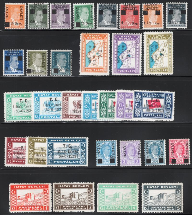 HATAY, 1939 MINT SETS, #1-11, 25-37, J1-J4 and J6-J9, all previously hinged except last set which is never hinged, fine-very fine, cat. $191.50