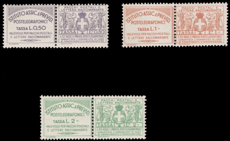 ITALY, 1936, 50c VIOLET, 1l ORANGE & 2l GREEN SE-TENANT INSURANCE STAMPS MINT NEVER HINGED, Sassone #12-14, fresh, very fine, cat. Sassone €3,600.00