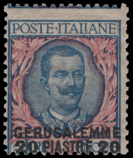 ITALIAN OFFICES IN JERUSALEM, 1909,20pi on 5l BLUE & ROSE MINT, #7, o.g., h.r., centered towards bottom, showing portion of adjoining stamp at top, fine, scarce, cat. $1,250.00