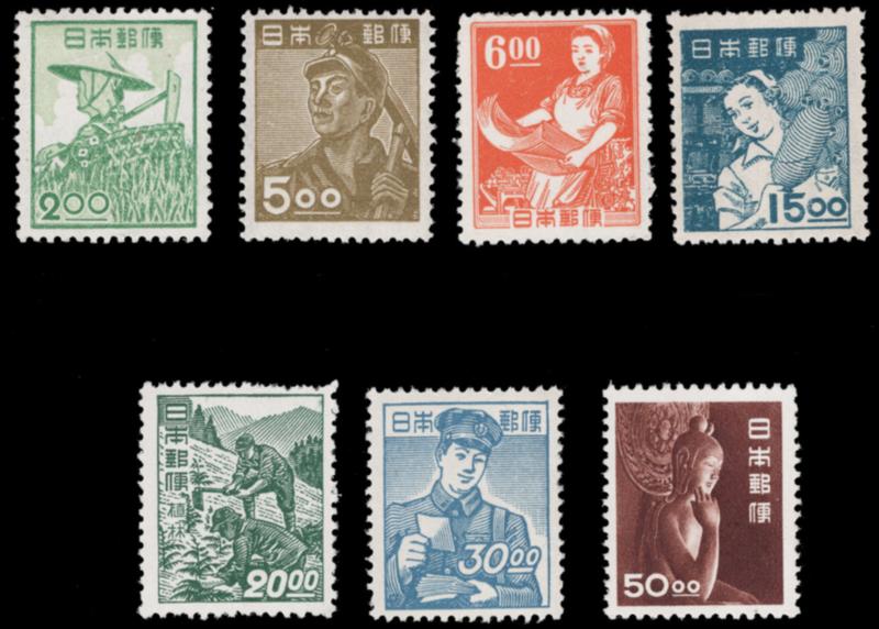 JAPAN 1948-51 REGULAR ISSUES NH, #425, 427, 429, 431, 433, 434, 521, fresh, fine-very fine, cat. $308.00