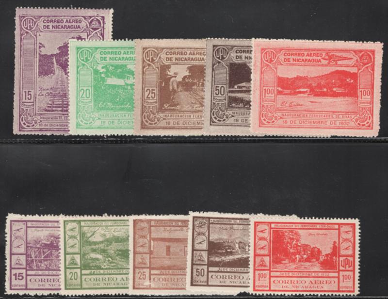 NICARAGUA, 1932 RAILROAD ISSUES AIR POST SETS UNUSED, #C67-C71, C72-C76, without gum as issued, fine-very fine, scarce, cat. $200.00