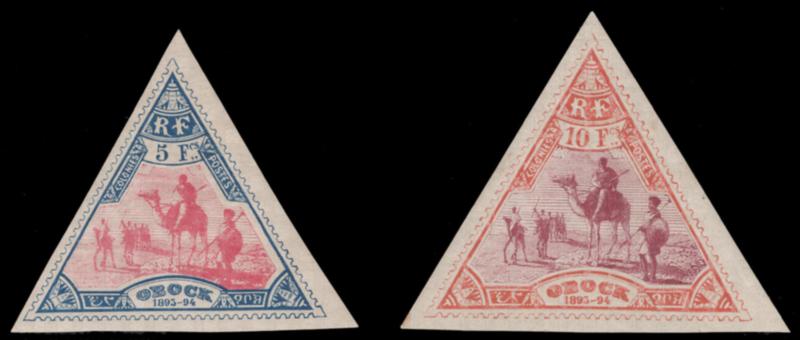 OBOCK, 5fr & 10fr CANEL AND RIDER MINT, #91-92, full margins, lightly hinged, fine-very fine, cat. $255.00
