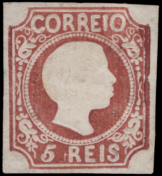 PORTUGAL, 1855, 5r RED BROWN TYPE VII UNUSED, #5, ample margins clearing all sides, without gum, minute tear at top in margin above "CO", embossing just cut thru at the back of the head, fine example of a rare stamp, older expert signature Mariminn, with 2025 Pascal Scheller short cert., cat.
