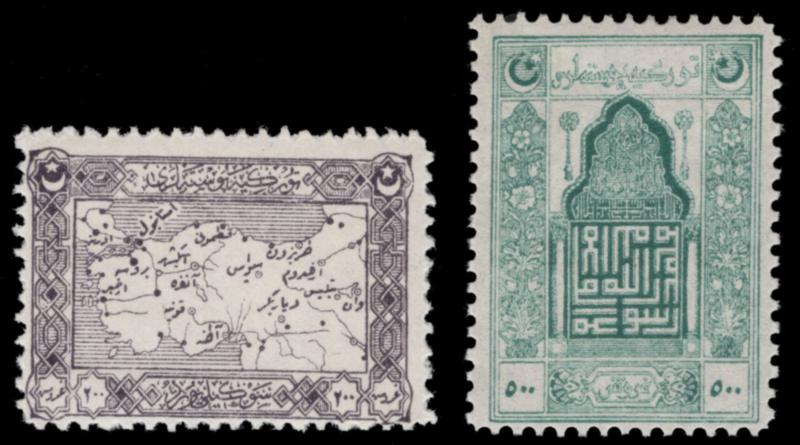 TURKEY IN ASIA, 1922, 200pi SLATE & 500pi GREEN, #88-89, 100pi mint never hinged, 500pi lightly hinged, fine-very fine, cat. $1,085.00