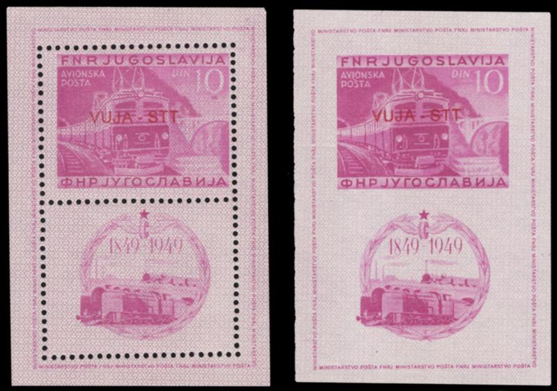 YUGOSLAVIA - TRIESTE, 1950, TRAIN SOUVENIR SHEET BOTH PERFED AND IMPERFED NH, #C17, C17a, fresh, fine-very fine, cat. $400.00