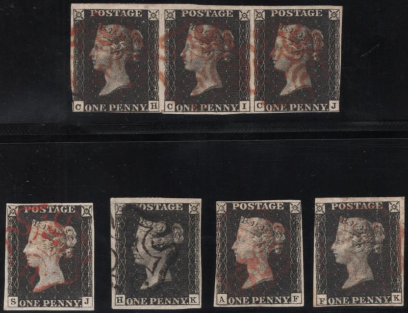 GREAT BRITAIN, 1840, 1 p BLACK USED, #1, four singles and a strip of three, small flaws, margins as shown in the scan
