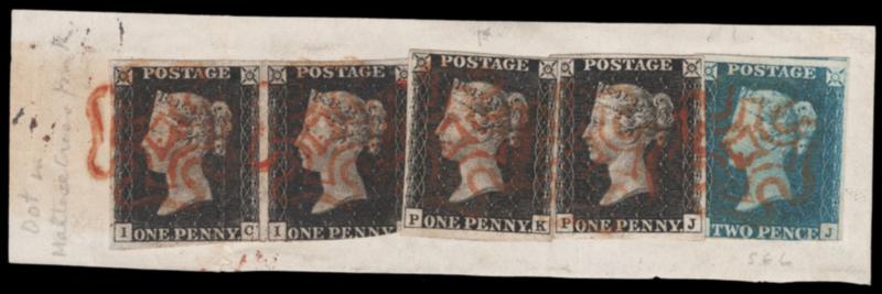 GREAT BRITAIN, 1840, 1p BLACK (4) & 2p BLUE WITH RED CANCELS ON PIECE, #1, 2, Penny Black in a pair and two singles, margins to in, small flaws, attractive and scarce piece