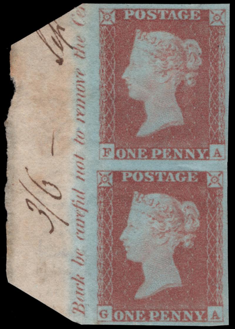GREAT BRITAIN, 1841, 1p RED BROWN ON VERY BLUED PAPER LEFT MARGIN IMPRINT VERTICAL PAIR, # 3, full margins all around, full o.g., top stamp lightly hinged, bottom stamp mint never hinged, folded vertically along the left edge of the image of the pair, a spectacular position show piece